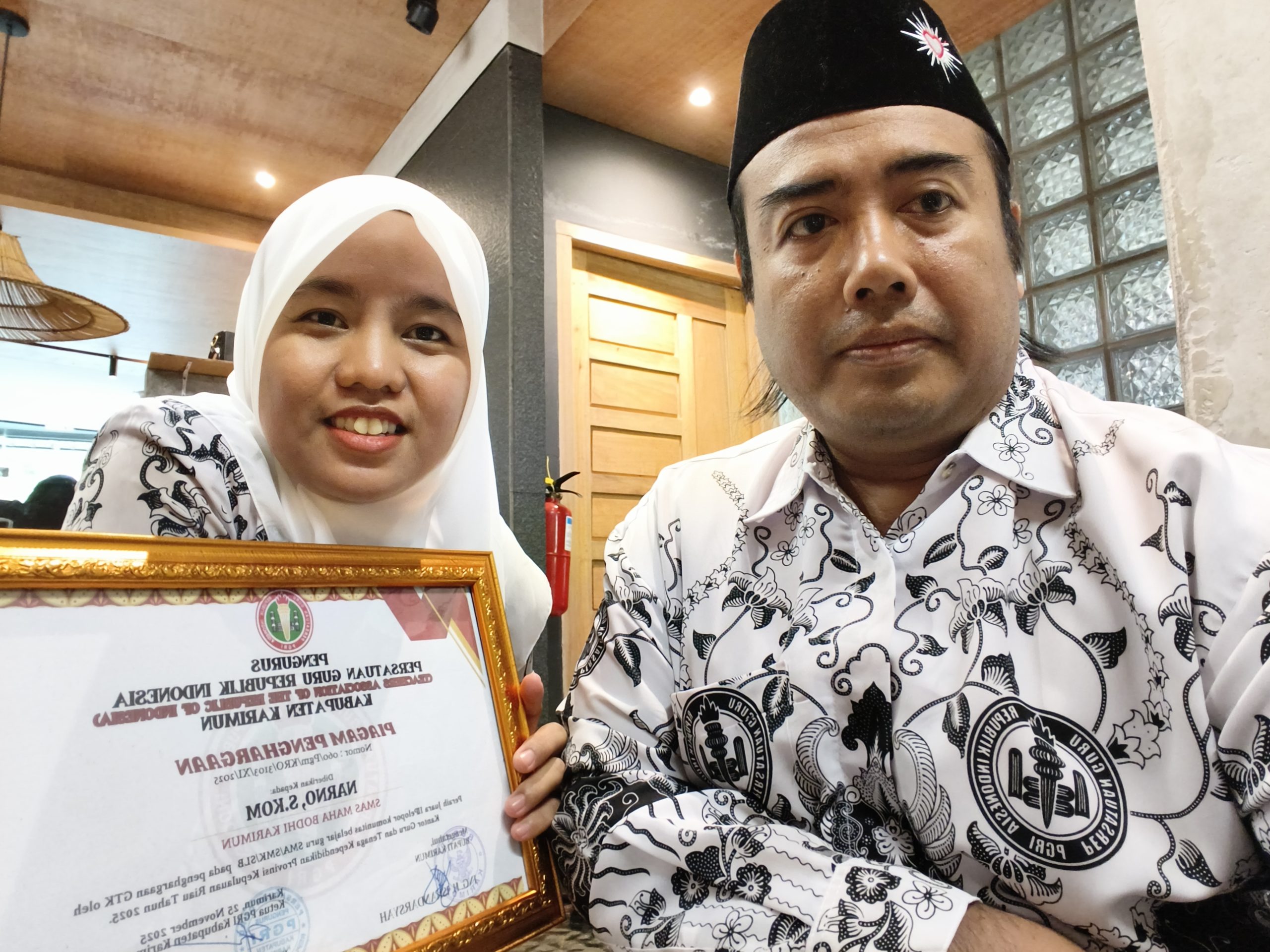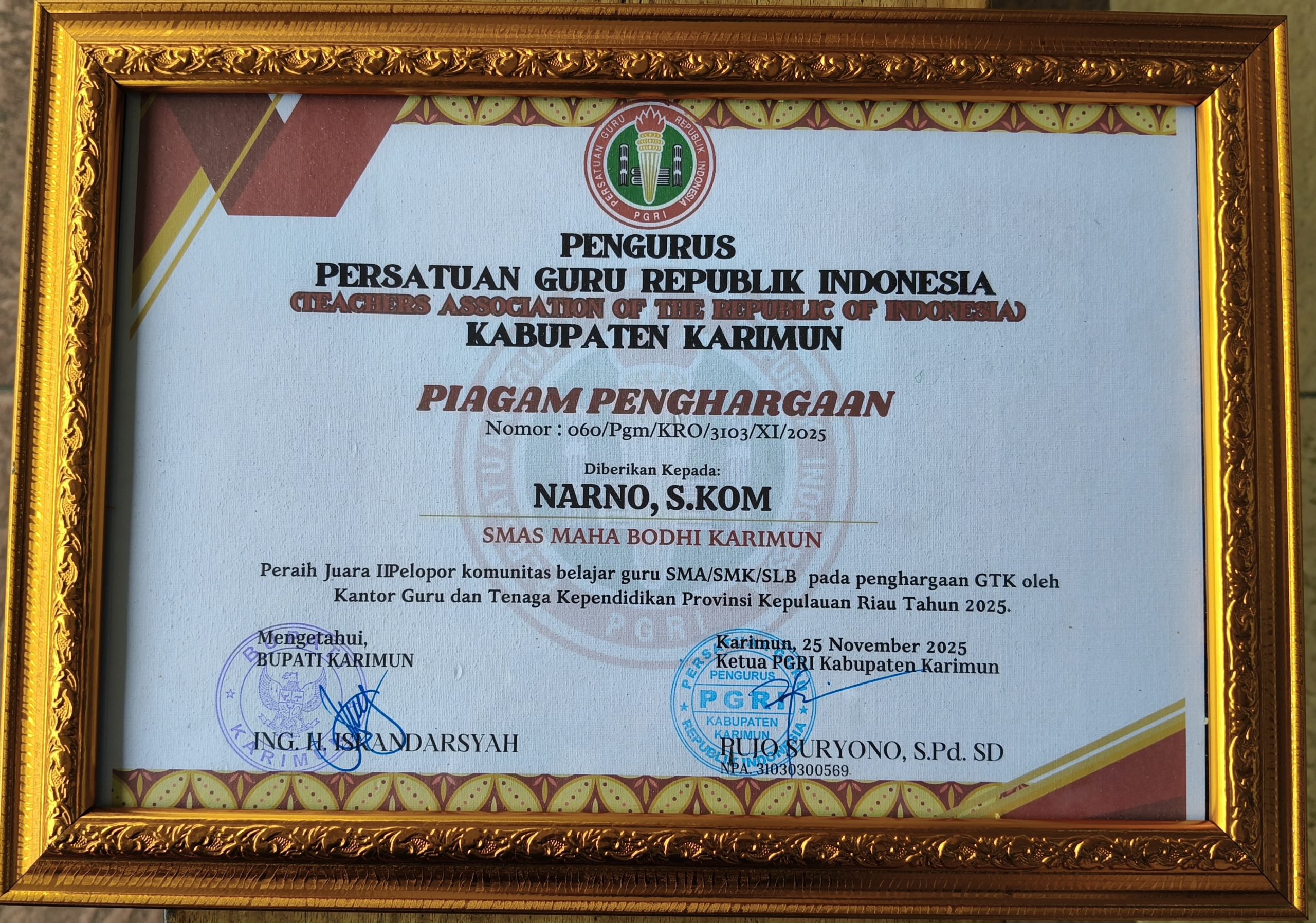 Penghargaan dari PGRI dan Bupati Karimun GTK berprestasi Juara 2 Pelopor Komunitas Belajar Guru SMA/SMK/SLB pada penghargaan GTK oleh Kantor Guru dan Tenaga Kependidikan Provinsi Kepulauan Riau Tahun 2025